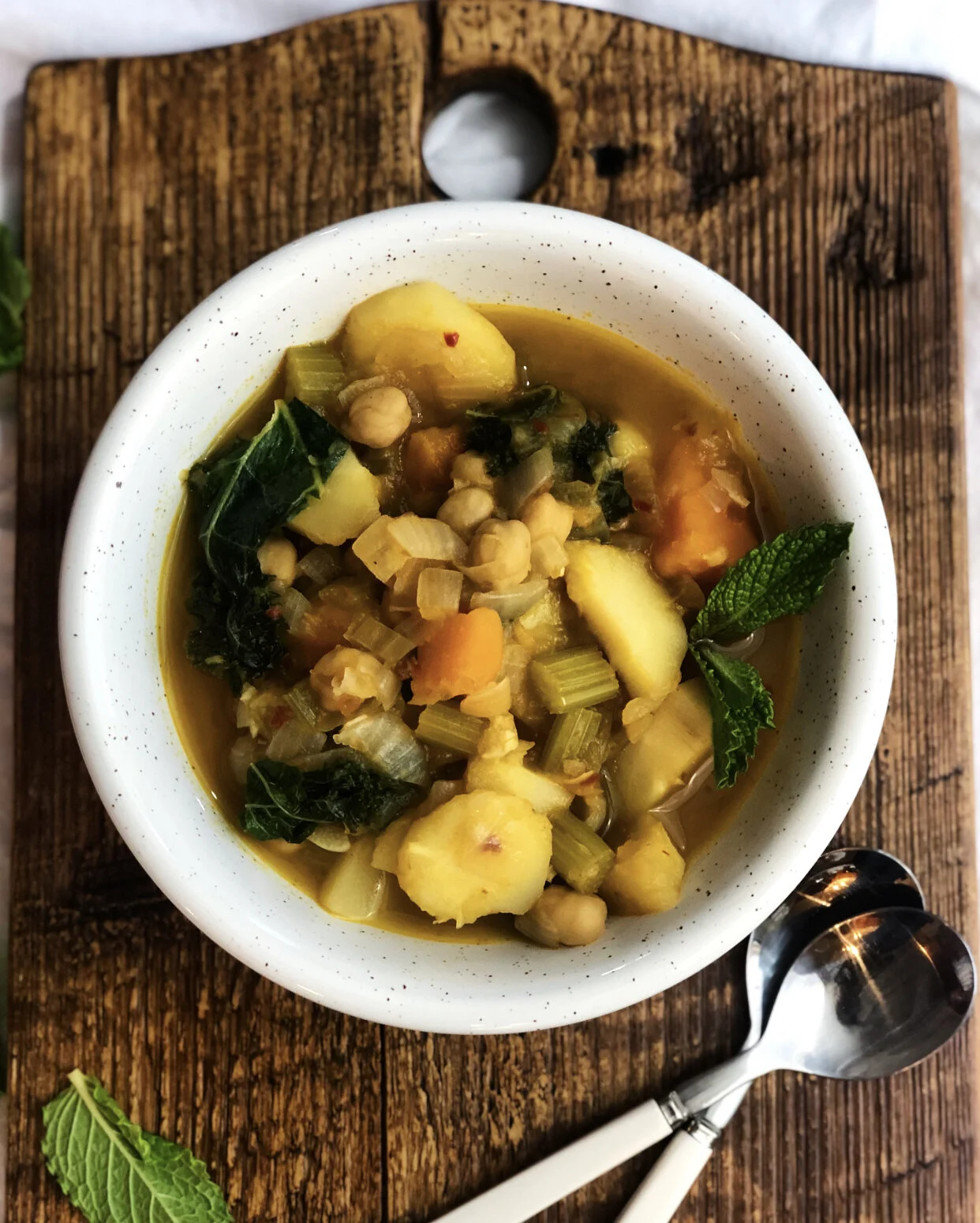 Add chickpeas (including their juice) and vegetable broth. Turn heat up to medium-high until it boils. Then, turn heat down to low and let simmer for 10-20 minutes, or until the sweet potatoes are easily pierced with a fork. Add in the kale (torn into 2-inch pieces) and stir until kale is wilted. Adjust harissa and salt to taste. Garnish with mint or your herb of choice. Serve!