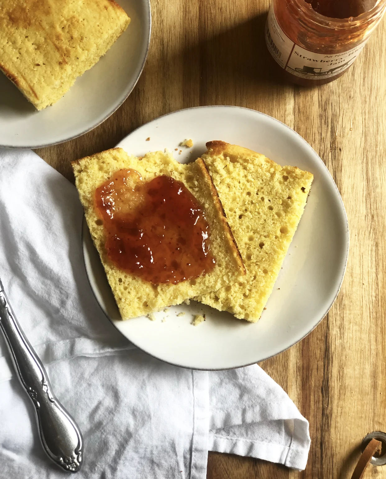 As a cornmeal lover, these corn cakes are everything I had been dreaming of. They are soft, light, cornmeal-y and crisp up perfectly when toasted. These characteristics combine to make these puppies the perfect companion for fresh summer fruit jams, jellies and compotes. King Arthur suggests baking the corn cakes in a special corn cake pan to form rounds, but I prefer the rectangular-shaped cakes that can be made with a regular 9" by 13" pan. These fit satisfyingly in my toaster and are the perfect serving size.